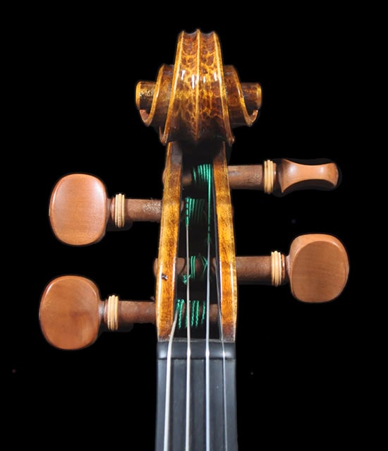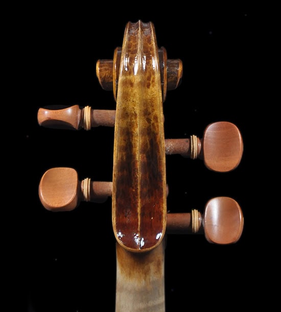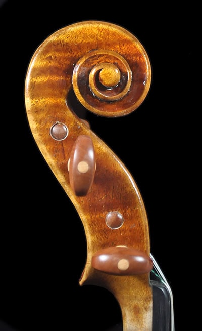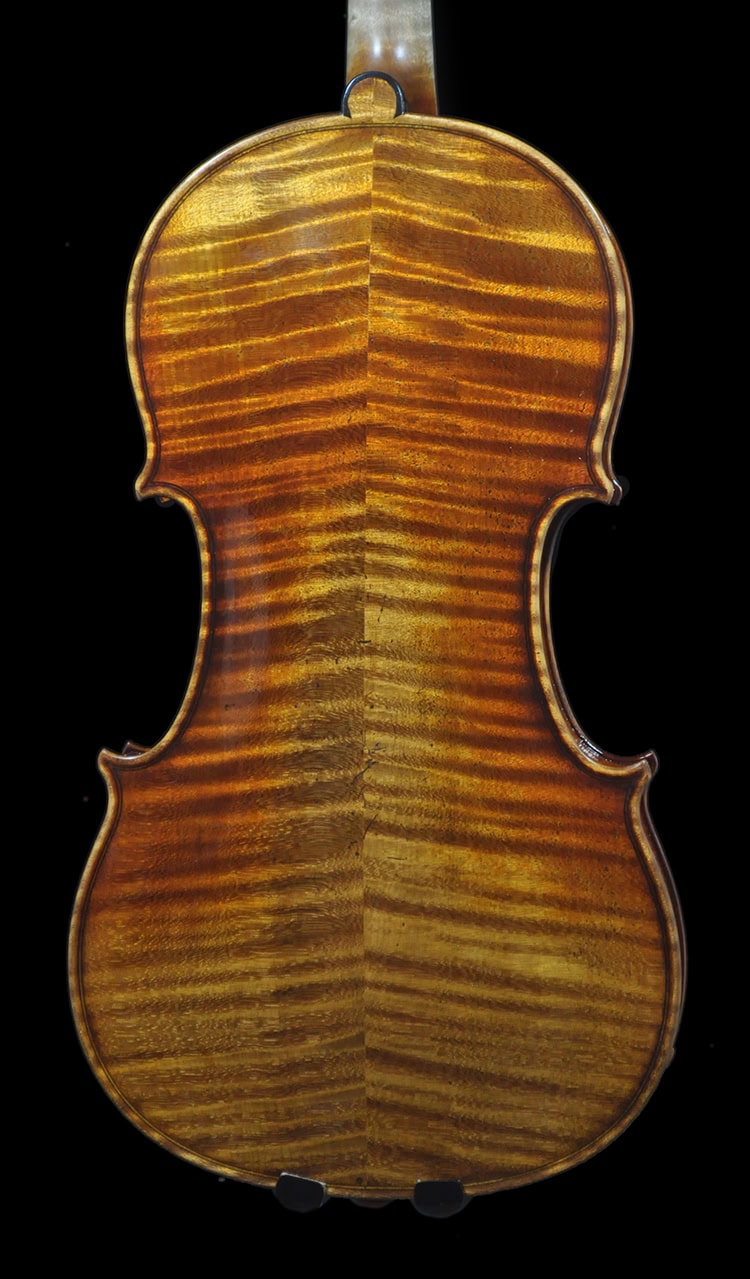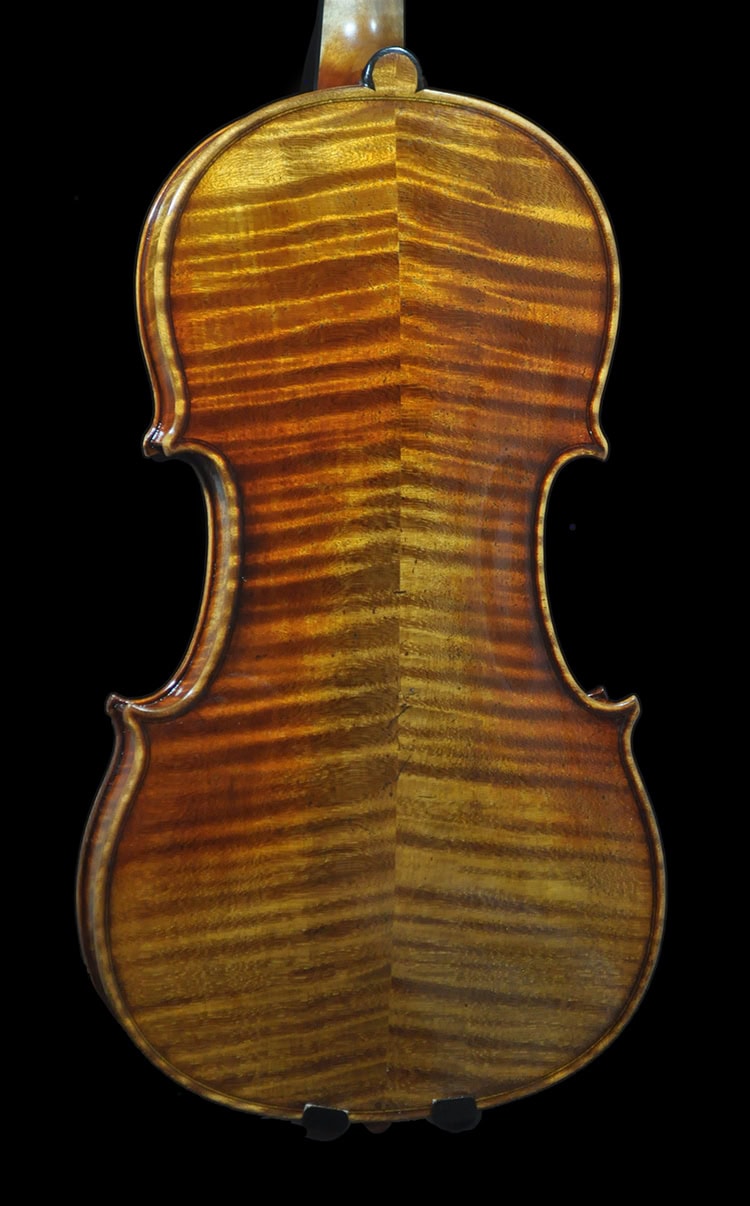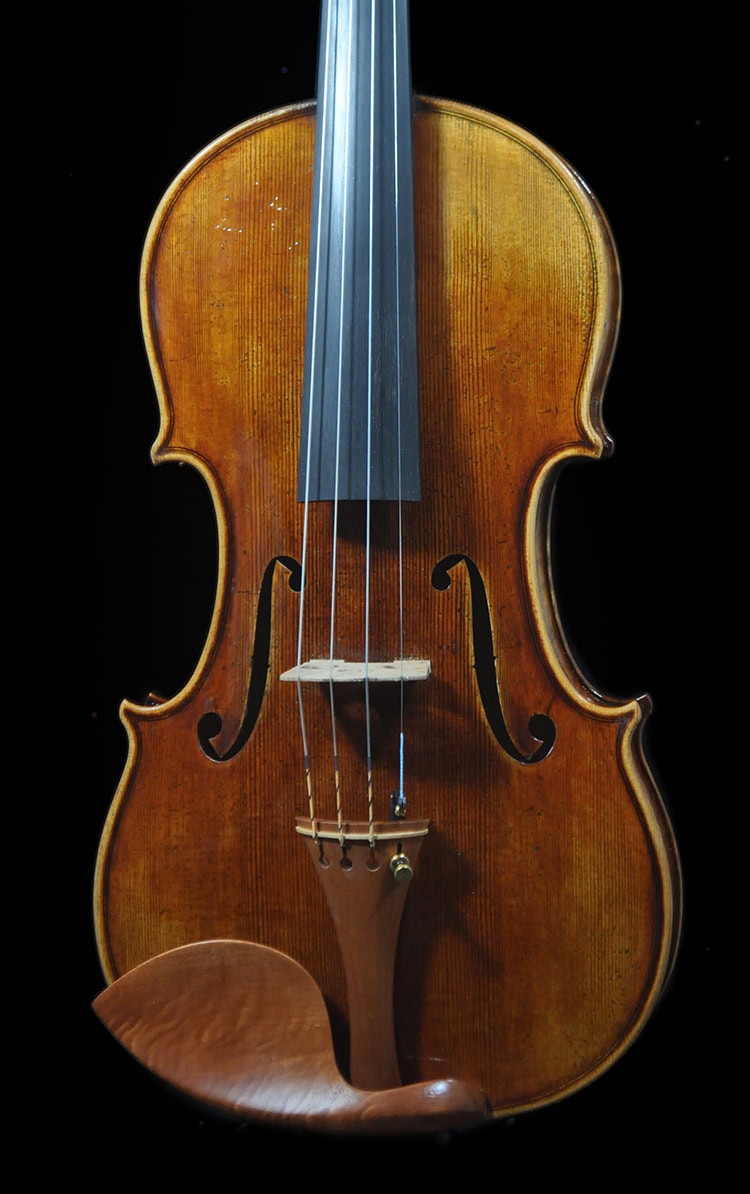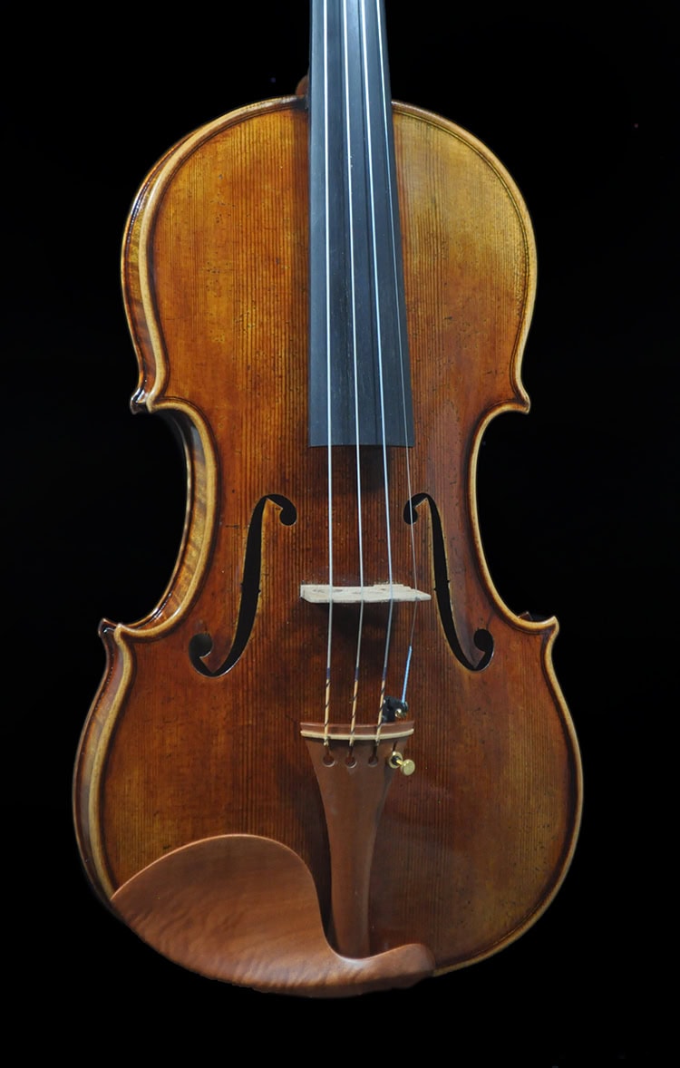 Deep, warm, robust tone that sings with great depth. Sweet ringing in mid range, strong projection that speaks with warm and clear definition. Focused brilliant E string with great sustain, warm projective tone as the audio clip shows, deep mature sound with the vintage vibe and voice. The perfect instrument for players looking for an authentic, vintage “Guarneri” vibe that meets the demand of virtuoso usage.