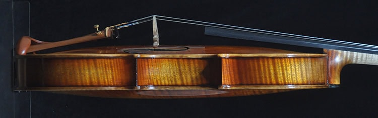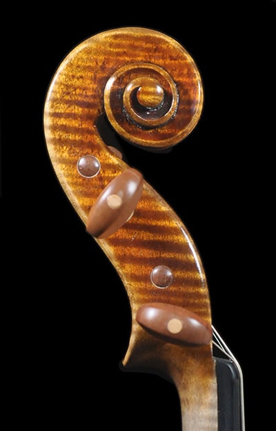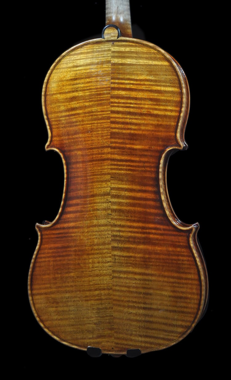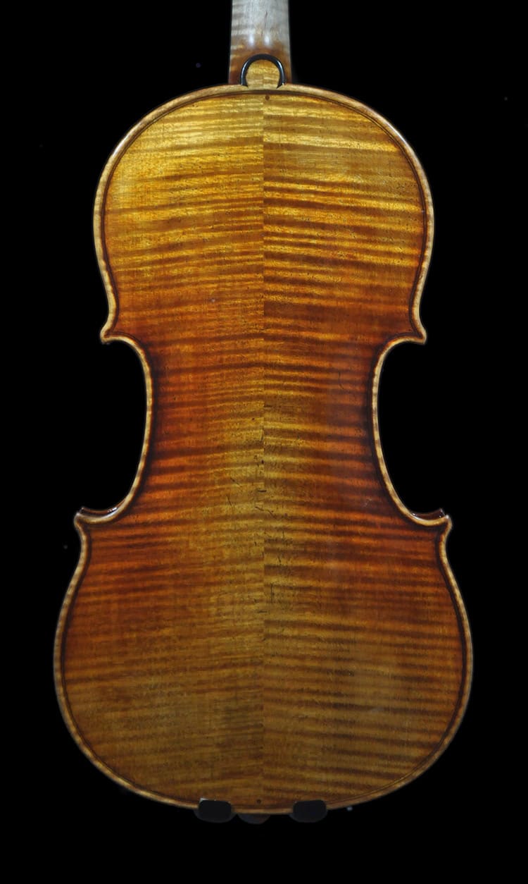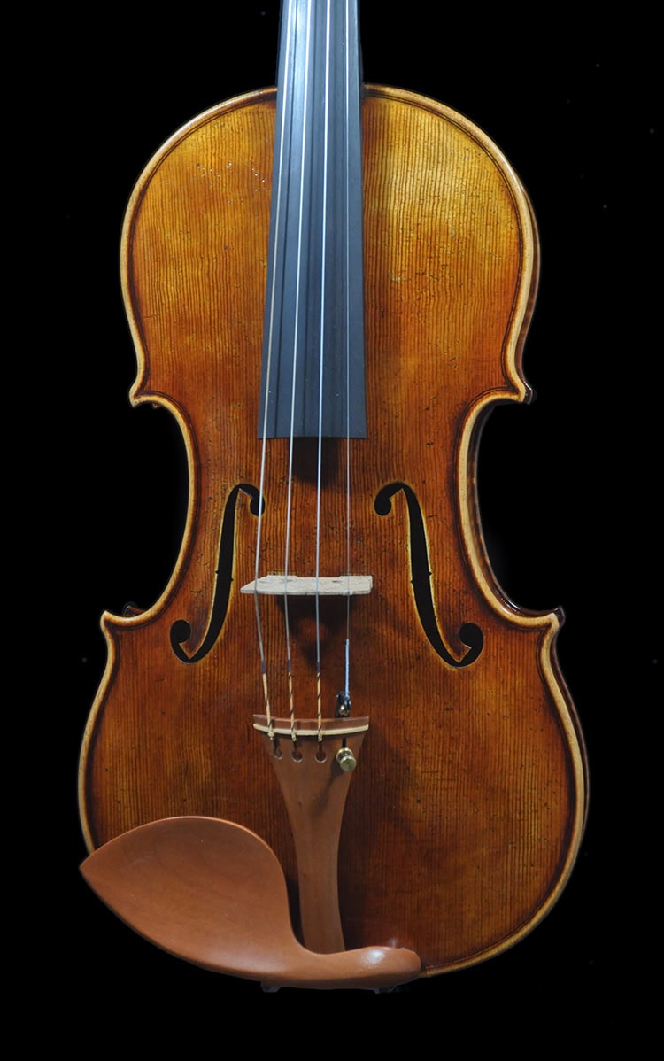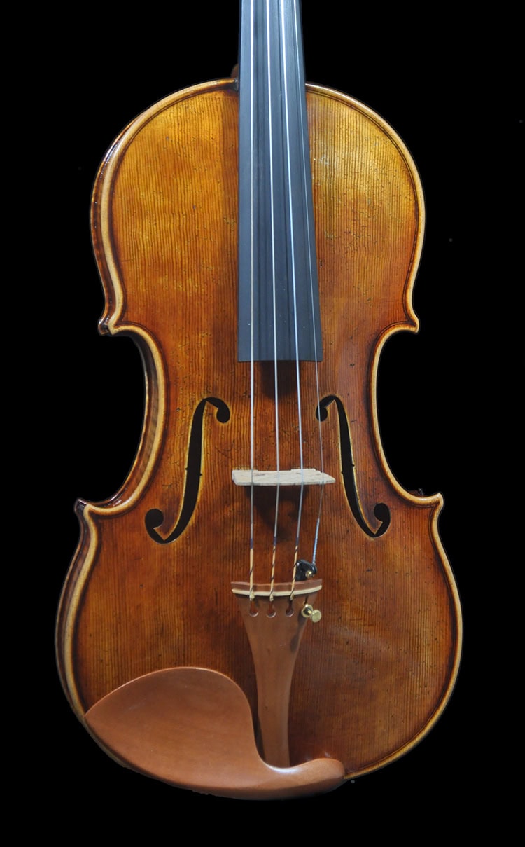 Powerful, deep, booming tone that sings with great depth. Rich ringing in mid range, strong projection that speaks with clear definition. Focused brilliant  E string with great sustain, warm projective tone as the audio clip shows, BIG sound with powerful ringing overtone. The perfect instrument for players looking for an authentic, vintage “Guarneri” vibe that meets the demand of virtuoso usage.