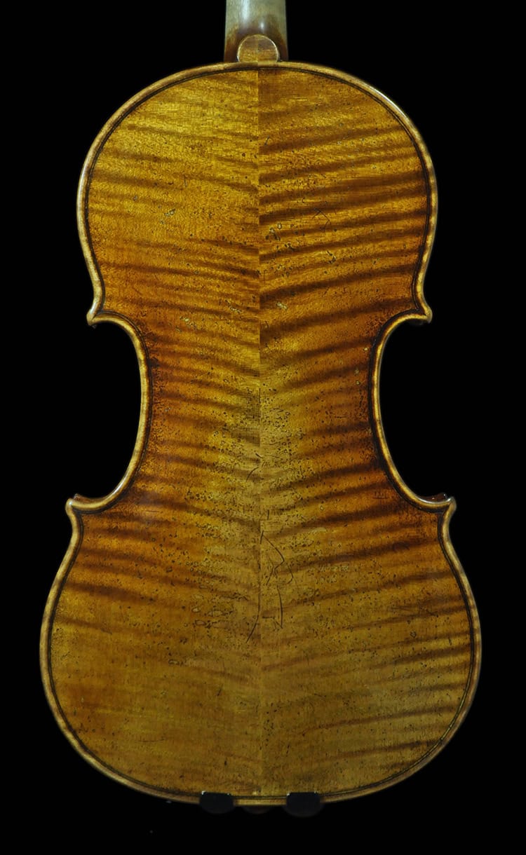 A superior “Cannone” Guarneri with a thick, mature DARK tone and powerful projection! Exquisite antique appearance featuring top grade European sprue and reversed flame maple back attributes to the original Cannone. Highly collectable for serious musicians and “Guarneri” lovers!