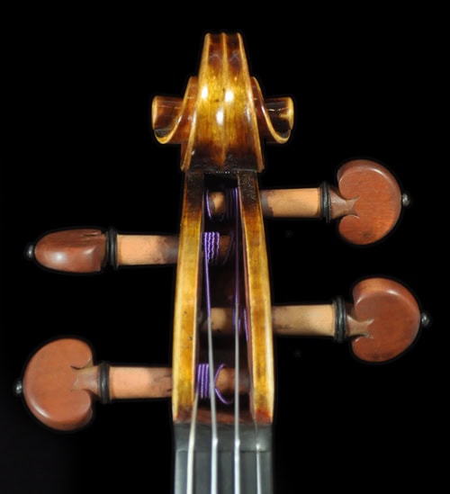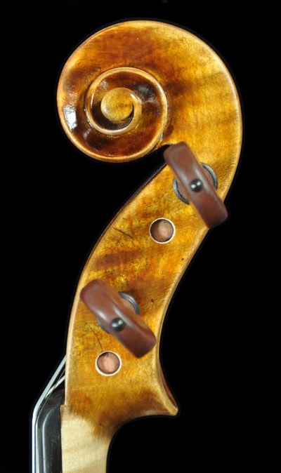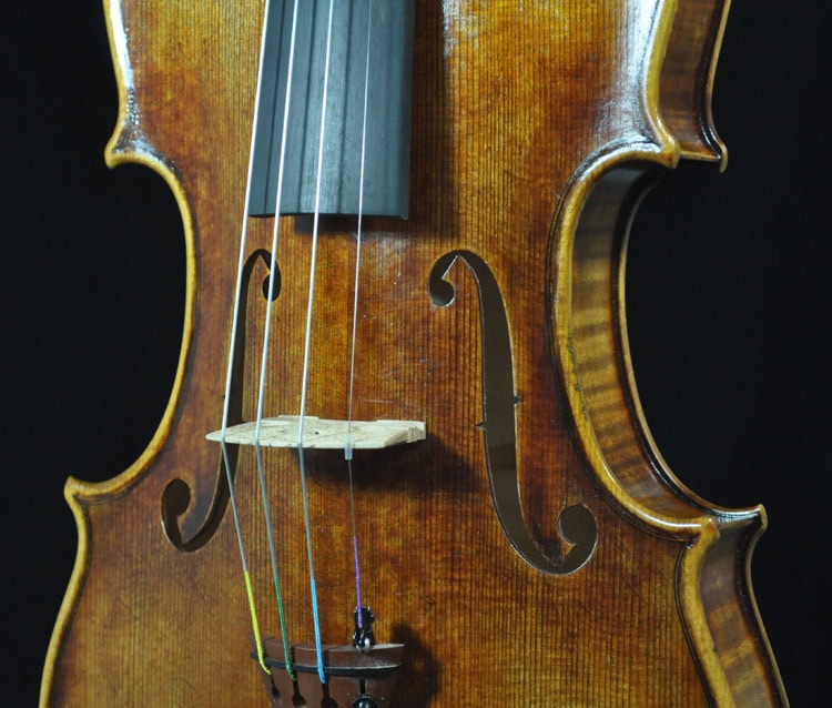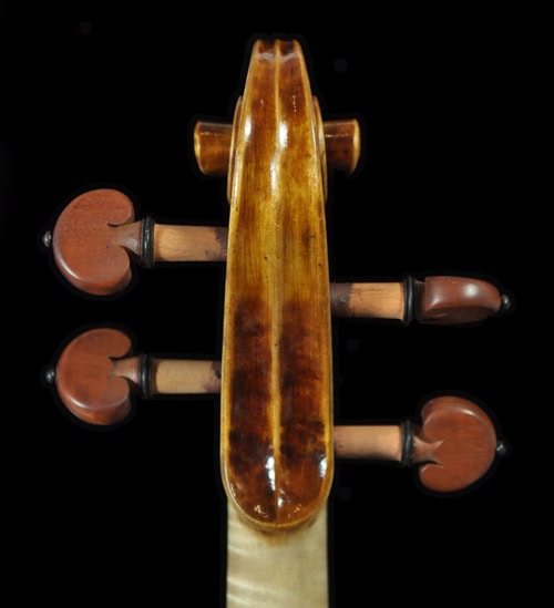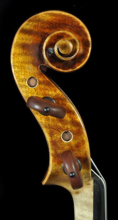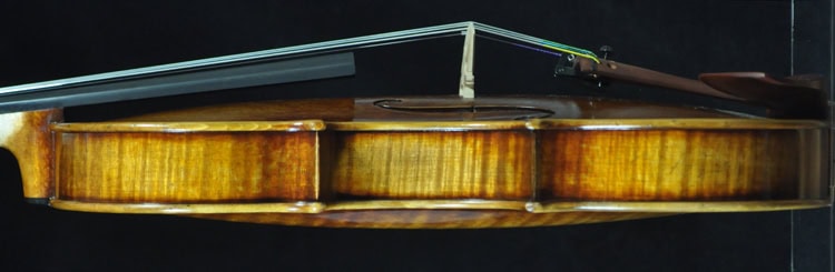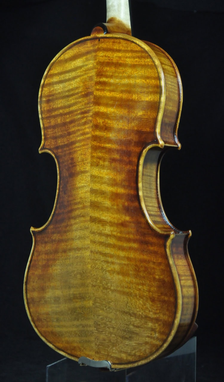 A 1:1 copy of 1745 “Leduc” Guarneri, built with complete set of European tonewood. Great depth and true dark sounding a del Gesu! Matching frequency plate tuned for a superb, resonant tone. Highly stylish scroll, long pattern f hole and bold body pattern as the original. THICK and warm tone on the G string, great depth and sings with bold dimension. A true dark sounding violin has a thick texture, yet still open and projective for easy playability.Fantastic tone and appearance value, highly recommend for pro/advanced players and collecto