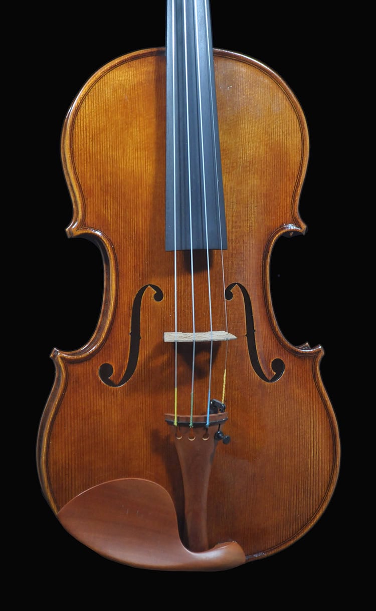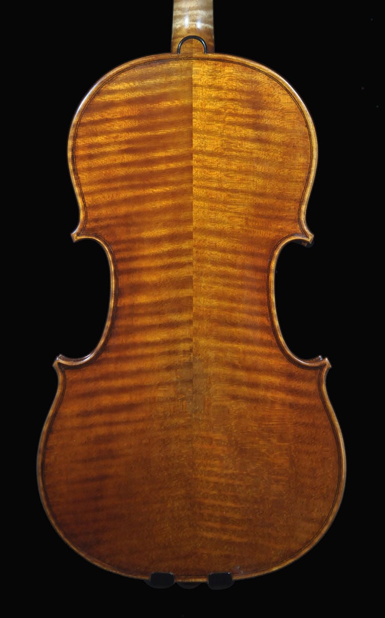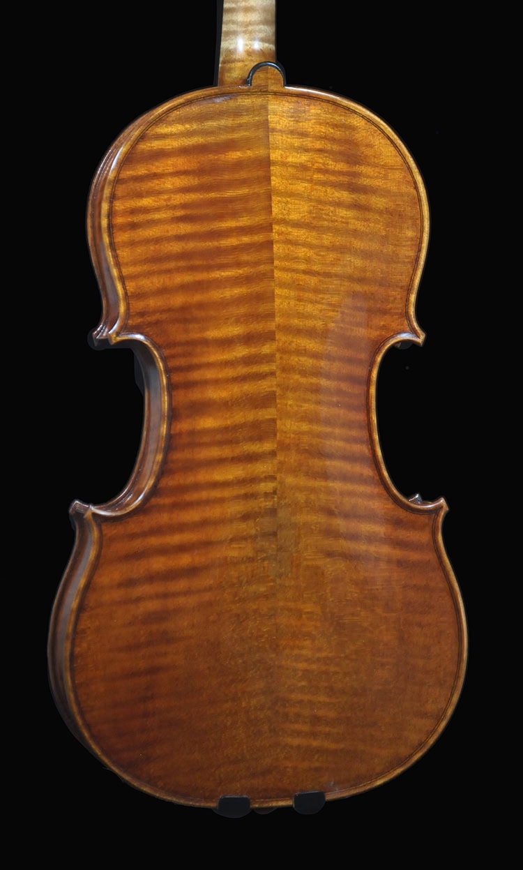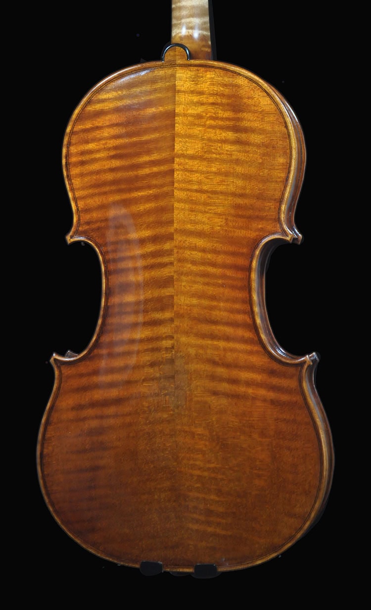 Lab plate tuned using the Hutchins tuning method, including density matching on top and back, thickness/graduation acoustically adjusted for max projection and resonance. Amber orange brown light antique varnish with Italian ground coat. Phenomenal resonance and projection that sings with a bold dimensional tone, highly projective voice and even across the strings! Easy to push while taking great bow pressure, speaks with great depth and projection as the audio performance clip represents. A superb example of great modern work that delivers the classic Stradivarius tone quality.