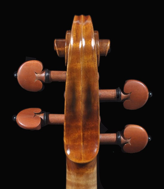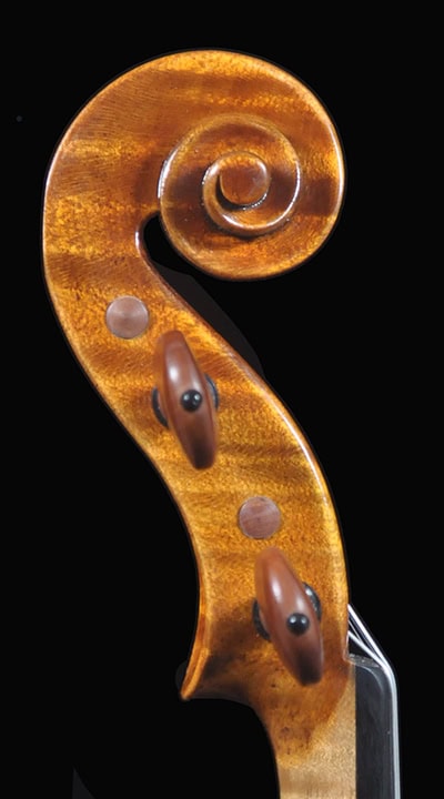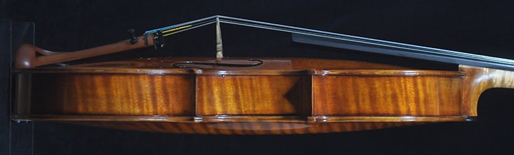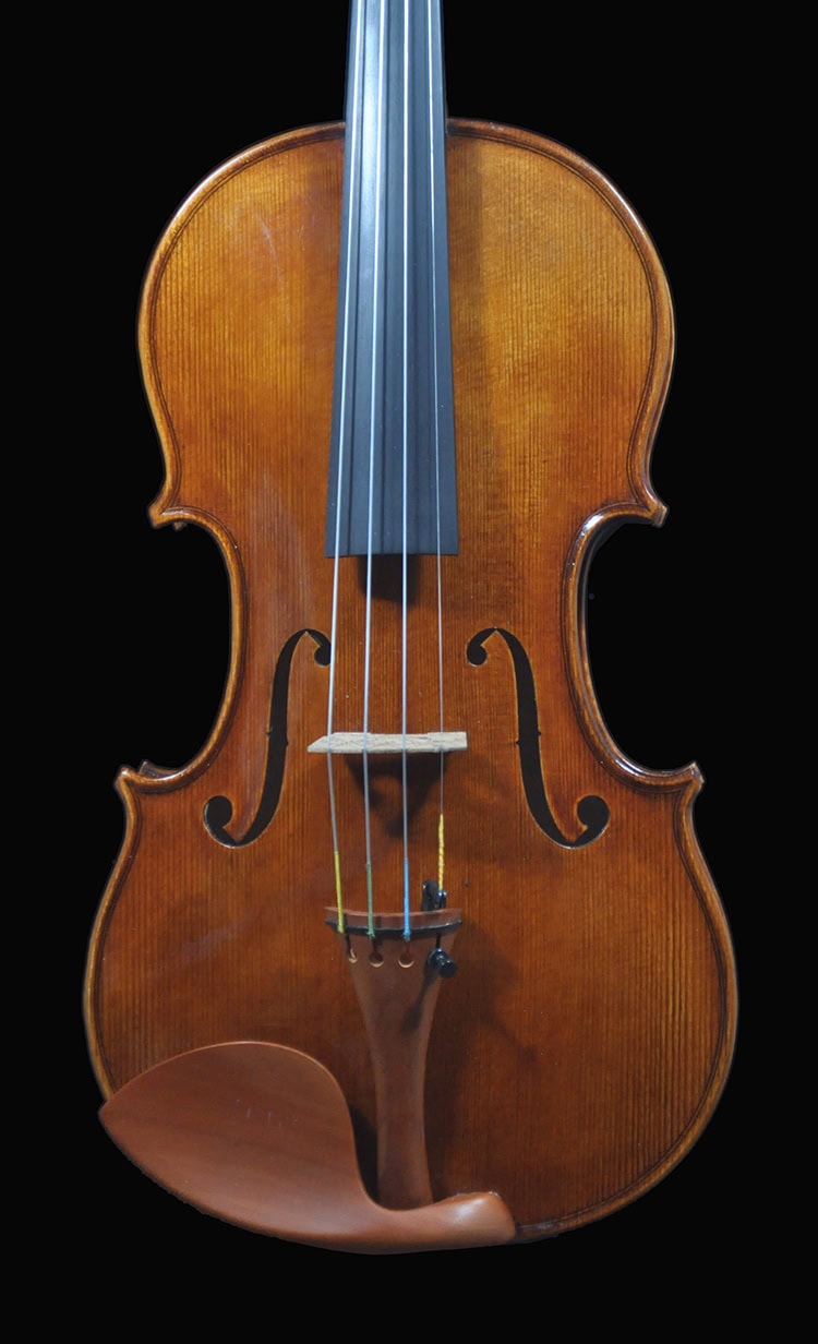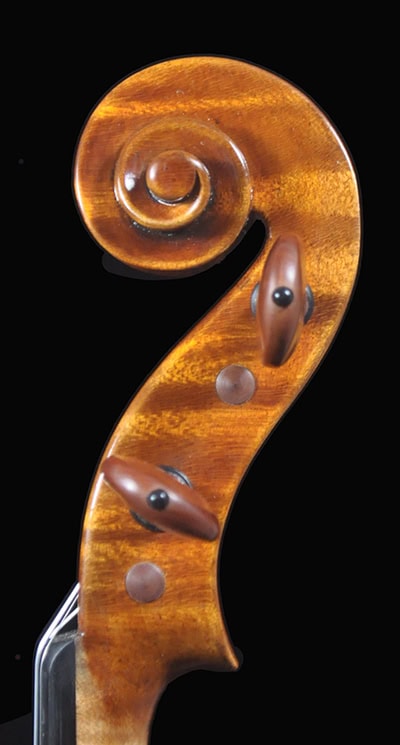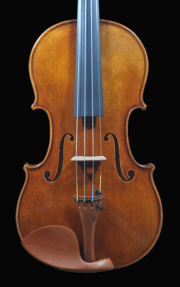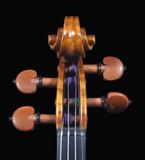 Lab plate tuned using the Hutchins tuning method, including density matching on top and back, thickness/graduation acoustically adjusted for max projection and resonance. Amber orange brown light antique varnish with Italian ground coat. Phenomenal resonance and projection that sings with a bold dimensional tone, highly projective voice and even across the strings! Easy to push while taking great bow pressure, speaks with great depth and projection as the audio performance clip represents. A superb example of great modern work that delivers the classic Stradivarius tone quality.