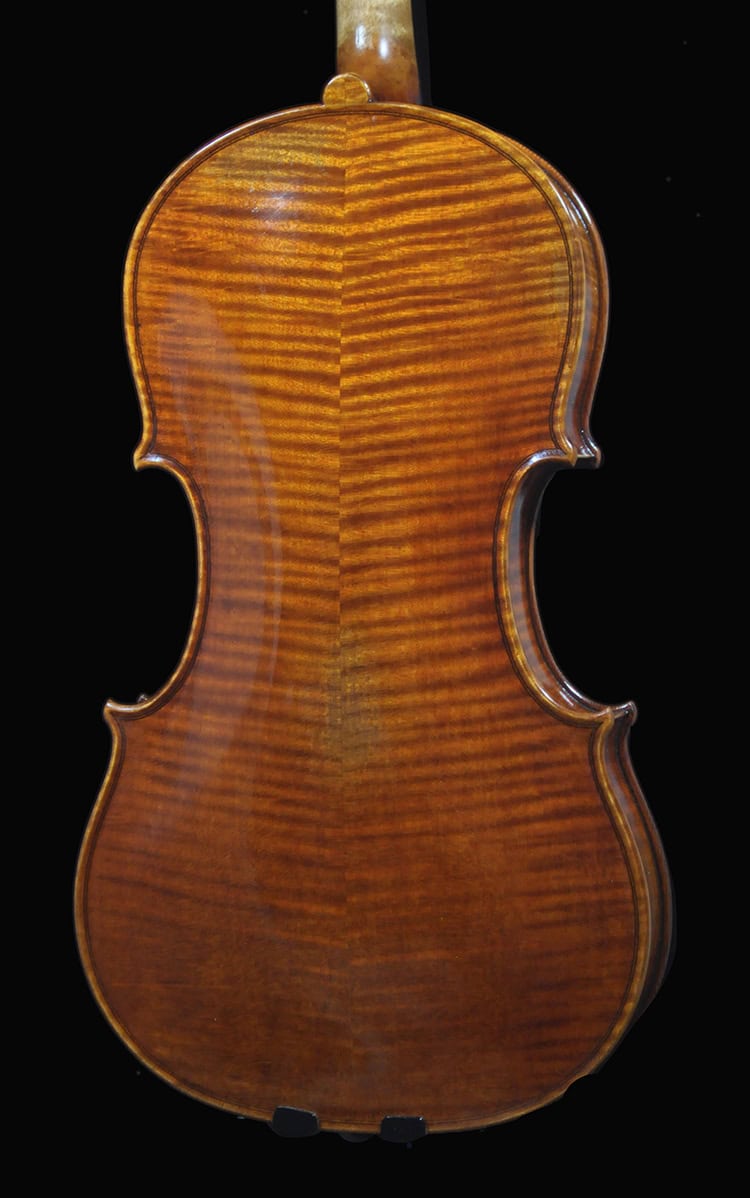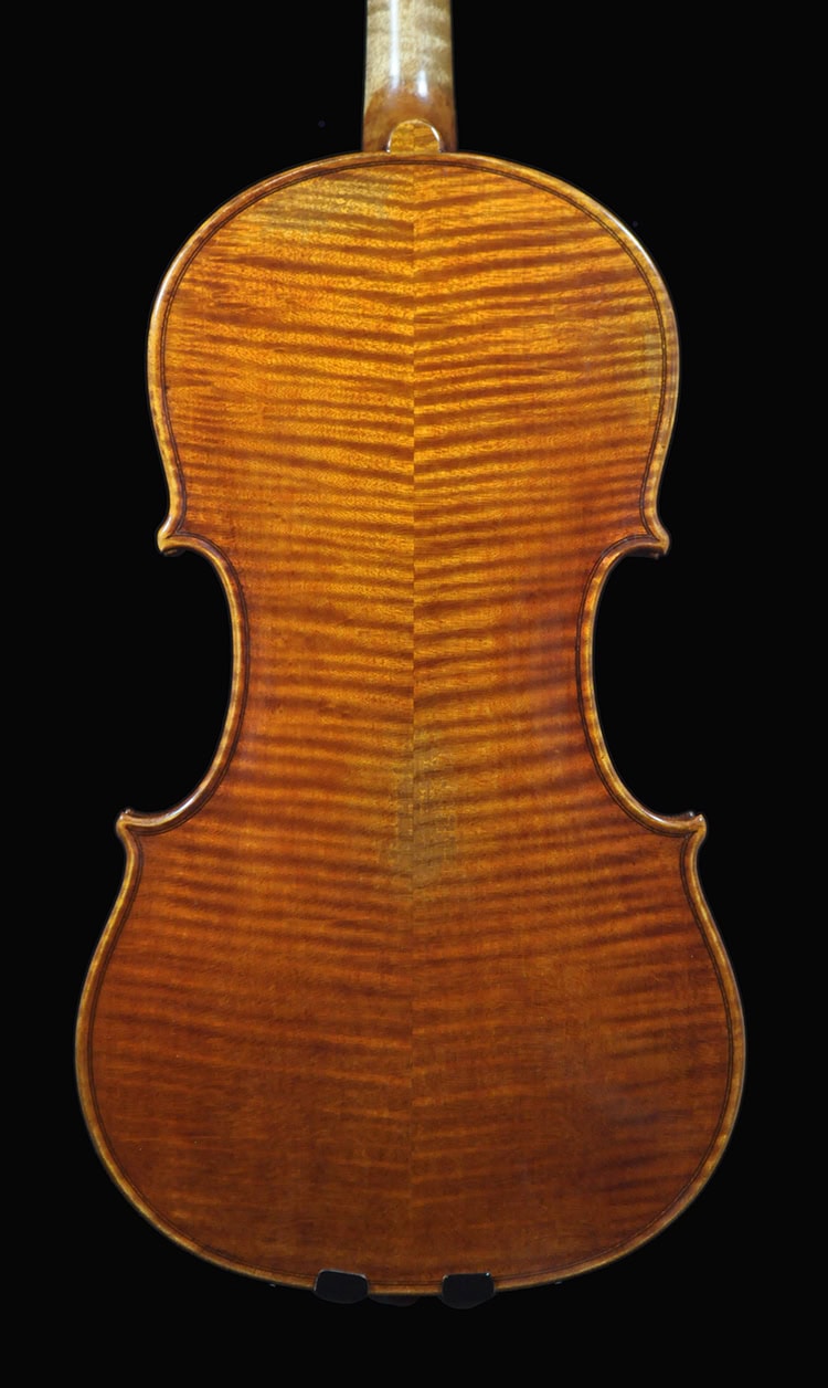 An upgraded from the previous version with aged Italian spruce and workmanship, true performance level “Cannone” Guarneri del Gesu that sings with projective deep tone, mature and clear tone as showcased in the audio clip! 25 yrs old Alps/Italian spruce and exquisite maple, flame pattern attributes to the original Cannone. Lab tested using the Hutchins plate tuning method, including density matching on top and back, arching/thickness/graduation acoustically tuned for max projection and resonance. Amber brown antique varnish with Italian golden brown ground coat. Sonorous, open tone with thick texture on G string, ringing yet warm voice that’s projective in distance! Rich sweet voice in the mid register, rich character that sings in a rounded tone. Brilliant and penetrating tone on E string, wonderful overtone that projects with great sustain. A powerful, deep sounding Cannone violin that sings with clarity and projection, smooth singing tone with great depth!