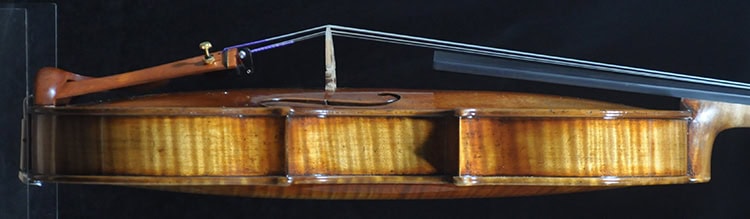 A deep, powerful strad sounding violin with brilliant E. Rich, warm, vibrant voice that sings with great projection and sound. Ringing and nature reverb within the instrument that brings out a vibrant tone at the ear, clear and vocal tone in distance as the audio/video showcases. A loud sounding strad that is on par with del Gesu, while having more depth and fullness than most strad pattern. 354 mm body length that will be suitable for majority of players, easy and smooth playability, set up with just enough resistance for soloirst usage.