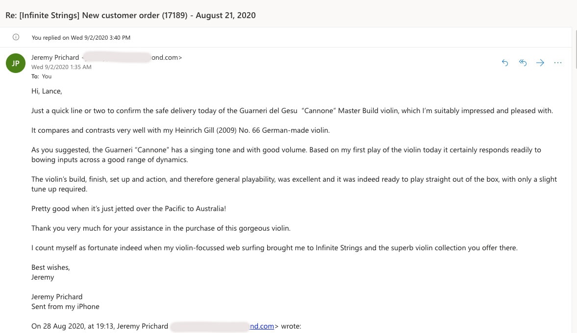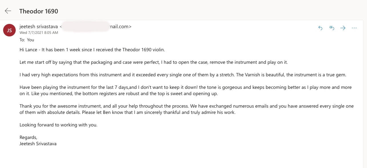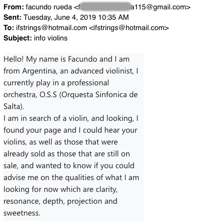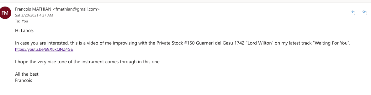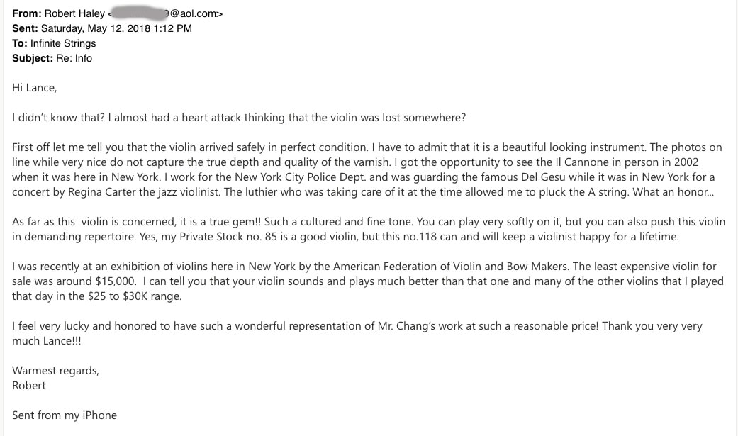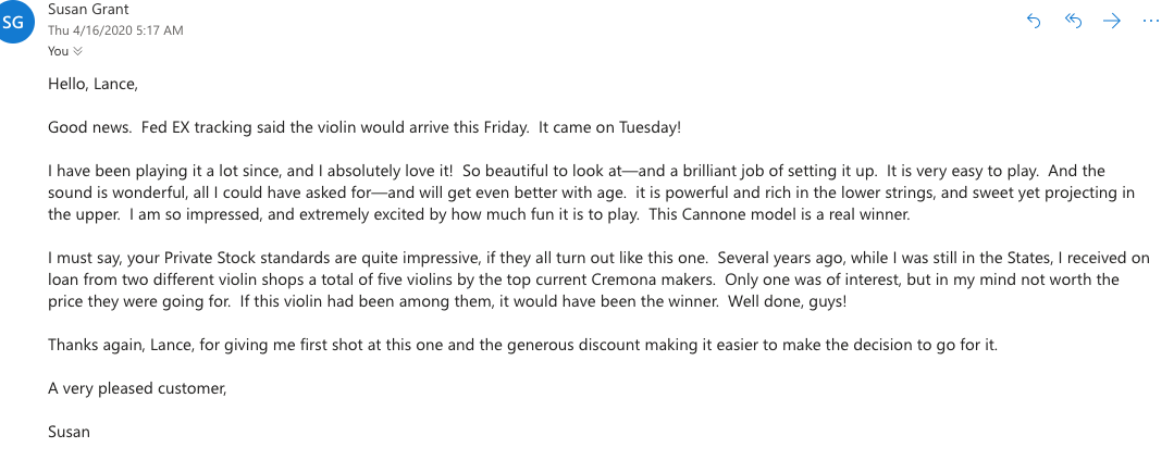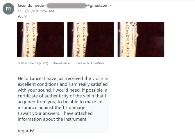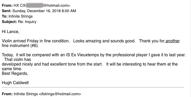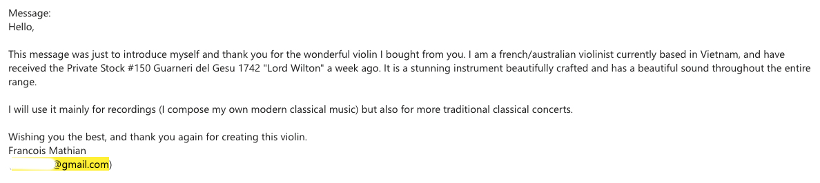 Customer from Cancun, Mexico, on Premium Antique Guarneri del Gesu 1745 “Leduc”