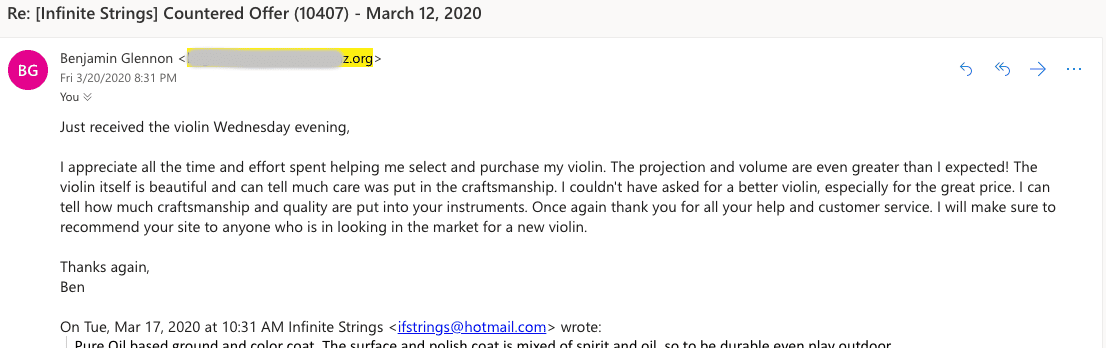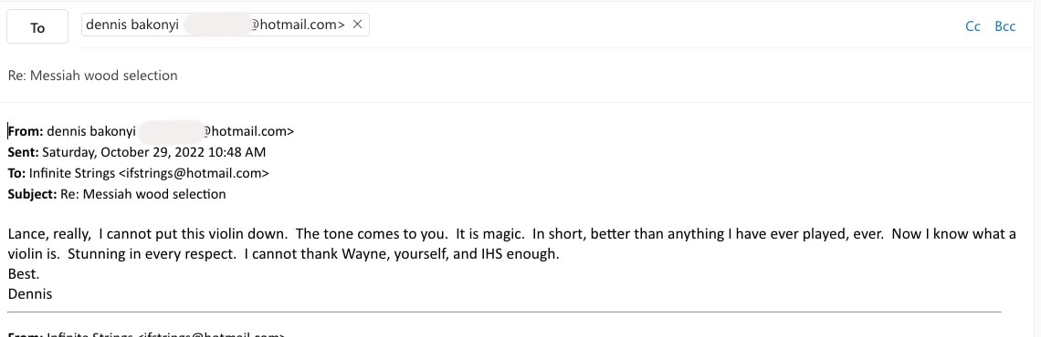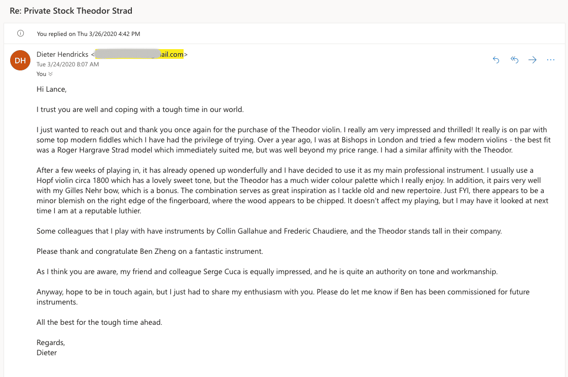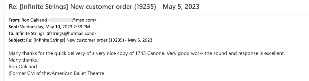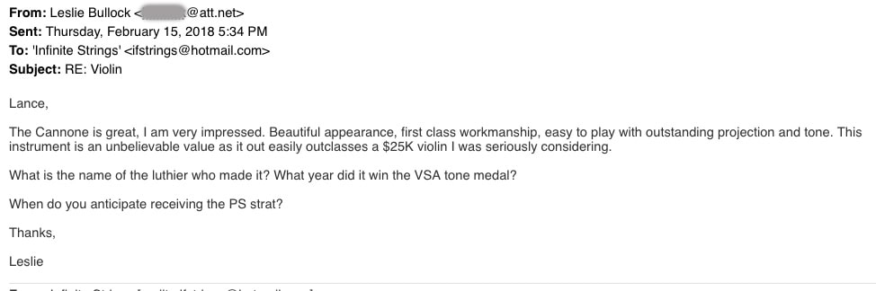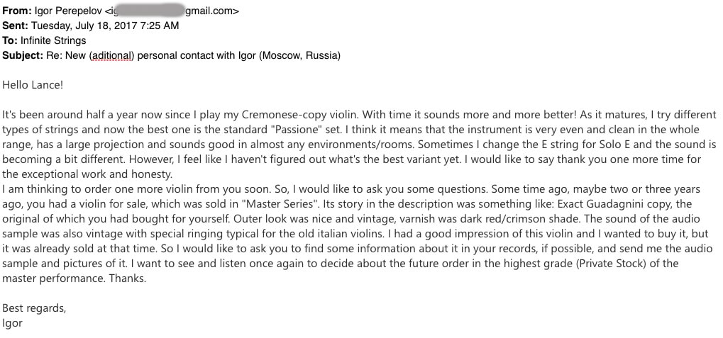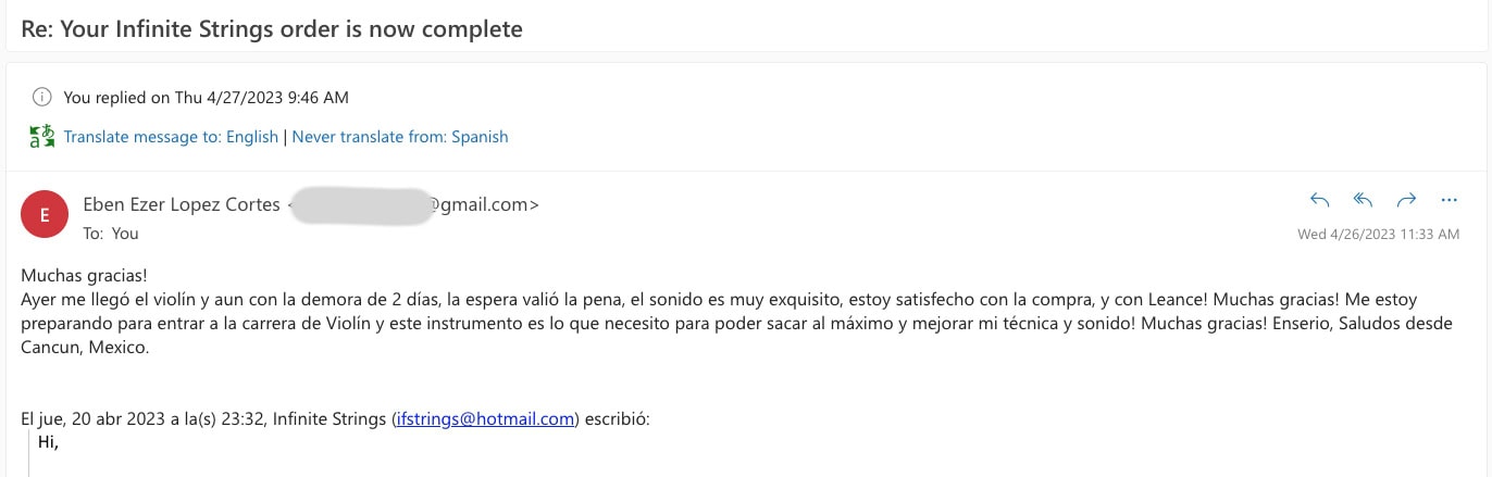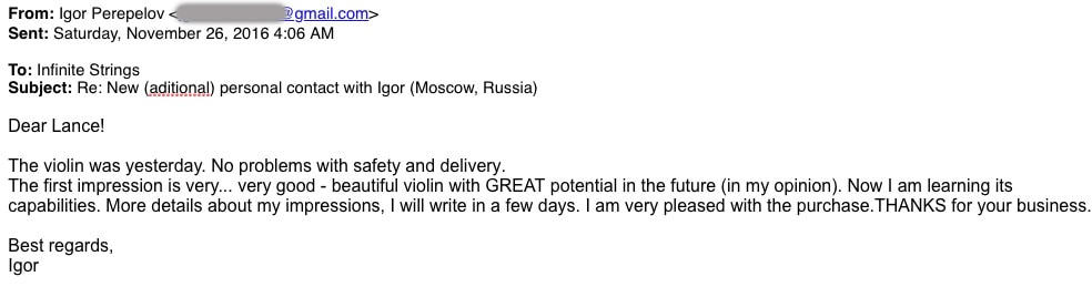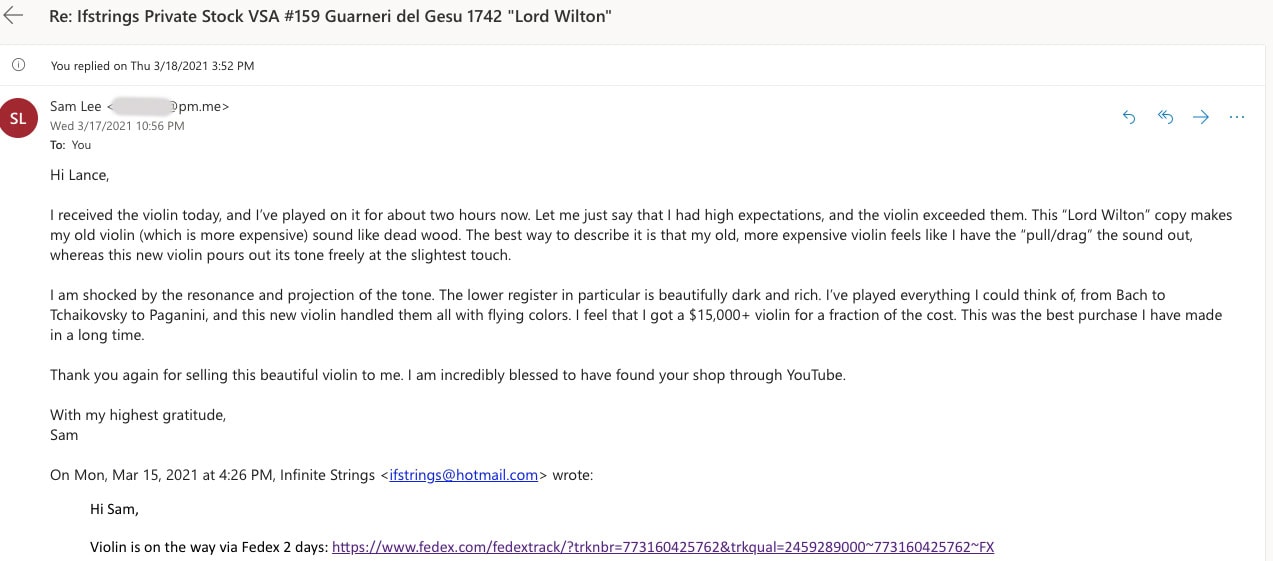 Customer from Cancun, Mexico, on Premium Antique Guarneri del Gesu 1745 “Leduc”