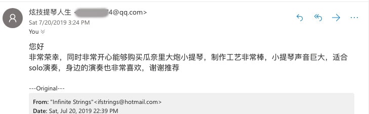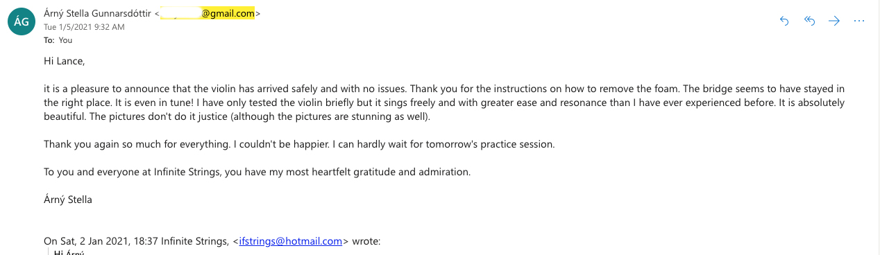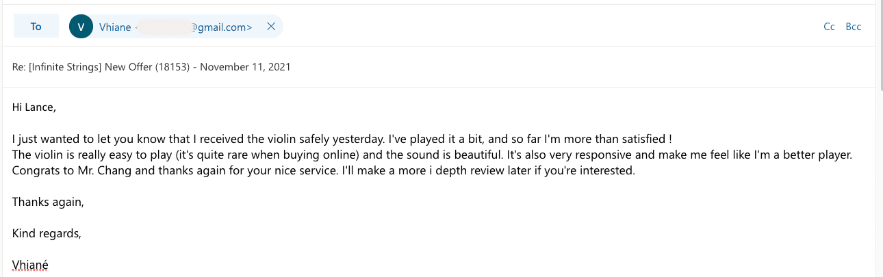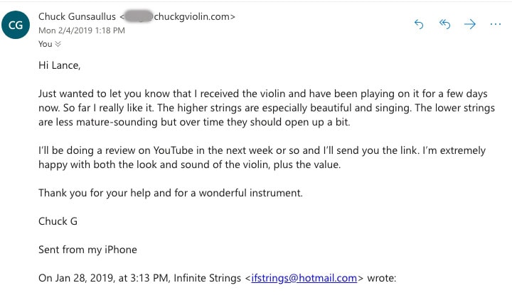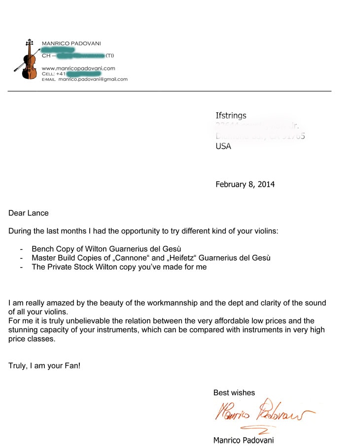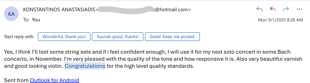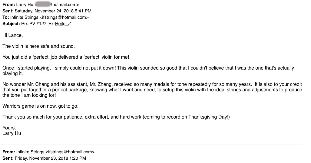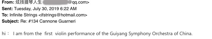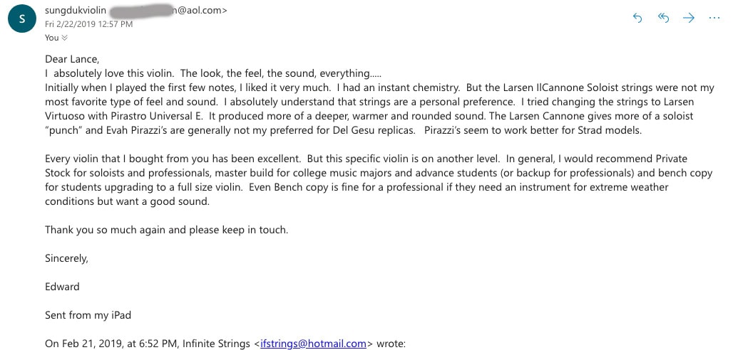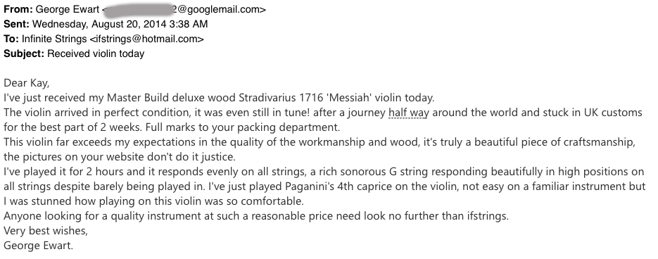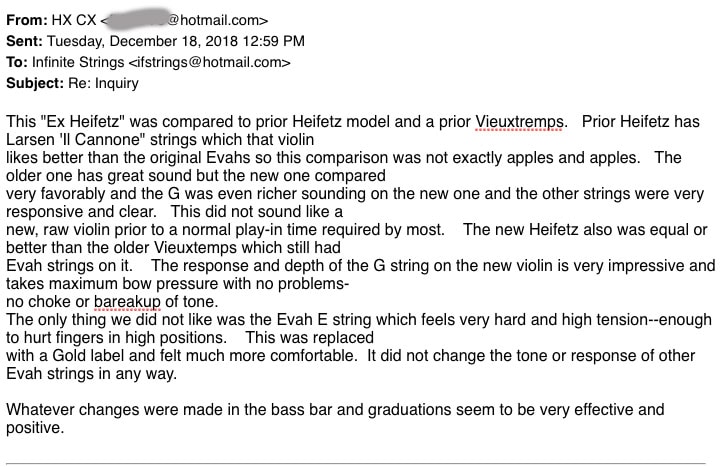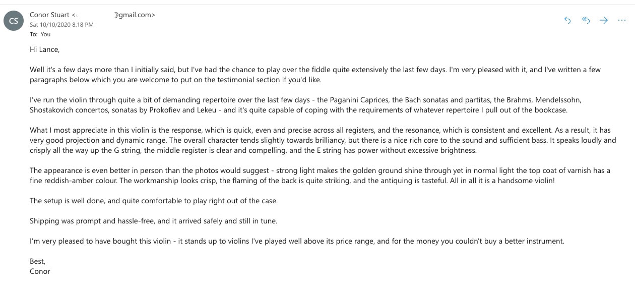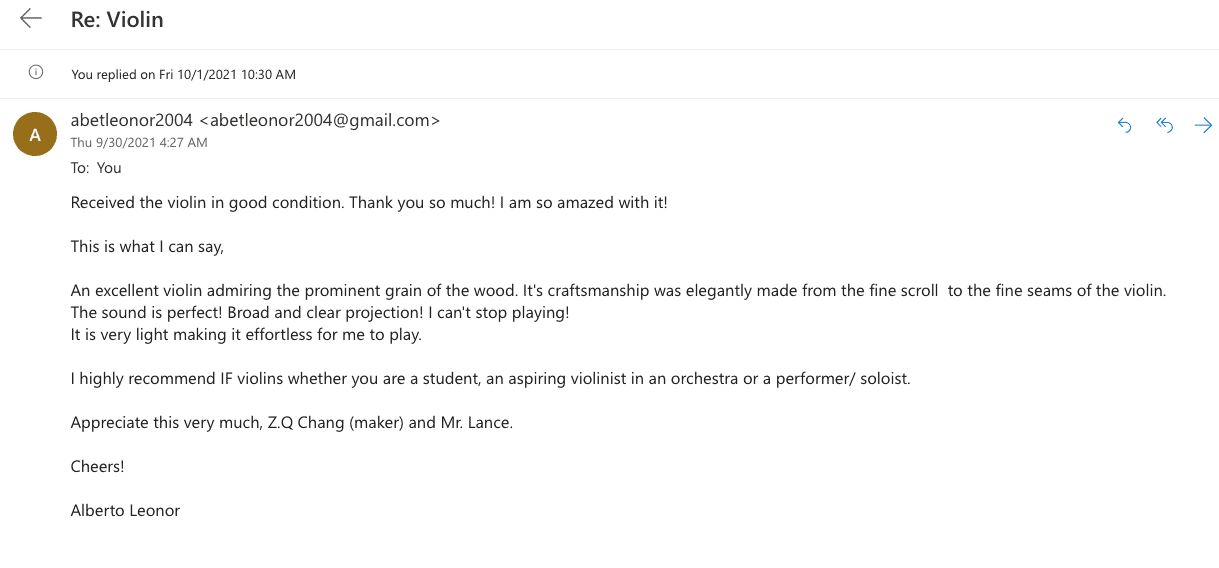 Below is a small portion of worldwide customers’ feedback we have received over the years, from concerts soloists, professional musicians, serious collectors, teachers, to aspirings violinists.
