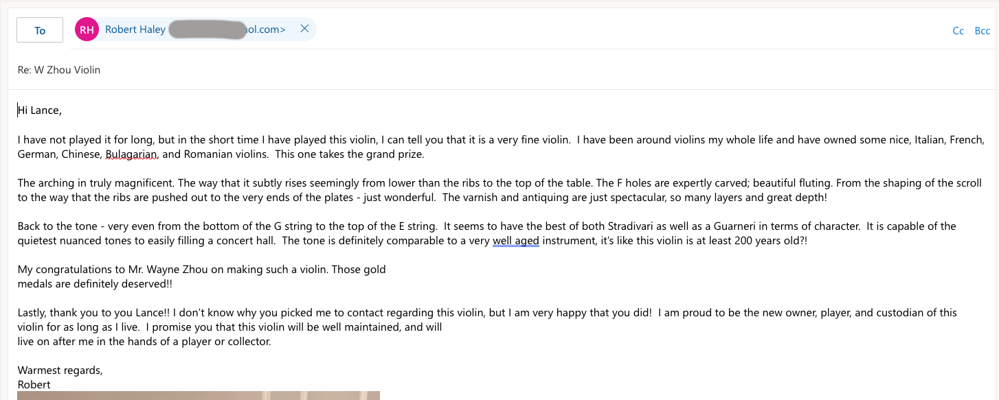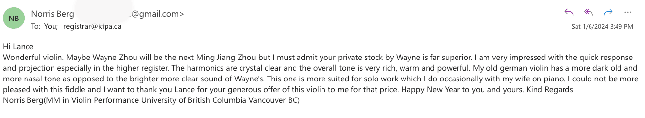 Wonderful violin. Maybe Wayne Zhou will be the next Ming Jiang Zhou but I must admit your private stock by Wayne is far superior. I am very impressed with the quick response and projection especially in the higher register. The harmonics are crystal clear and the overall tone is very rich, warm and powerful. My old german violin has a more dark old and more nasal tone as opposed to the brighter more clear sound of Wayne’s. This one is more suited for solo work which I do occasionally with my wife on piano. I could not be more pleased with this fiddle and I want to thank you Lance for your generous offer of this violin to me for that price. Happy New Year to you and yours. Kind Regards