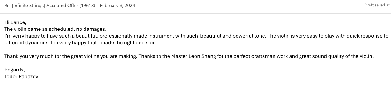 Thank you very much for the great violins you are making. Thanks to the Master Leon Sheng for the perfect craftsman work and great sound quality of the violin.