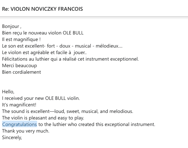 Bien reçu le nouveau violon OLE BULLIl est magnifique !Le son est excellent- fort – doux – musical – mélodieux….Le violon est agréable et facile à jouer..Félicitations au luthier qui a réalisé cet instrument exceptionnel.Merci beaucoupBien cordialementHello,