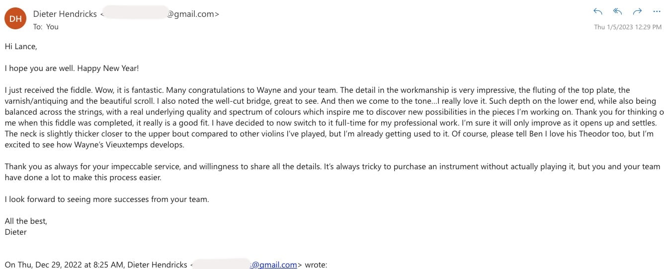 I just received the fiddle. Wow, it is fantastic. Many congratulations to Wayne and your team. The detail in the workmanship is very impressive, the fluting of the top plate, the varnish/antiquing and the beautiful scroll. I also noted the well-cut bridge, great to see. And then we come to the tone…I really love it. Such depth on the lower end, while also being balanced across the strings, with a real underlying quality and spectrum of colours which inspire me to discover new possibilities in the pieces I’m working on. Thank you for thinking of me when this fiddle was completed, it really is a good fit. I have decided to now switch to it full-time for my professional work. I’m sure it will only improve as it opens up and settles. The neck is slightly thicker closer to the upper bout compared to other violins I’ve played, but I’m already getting used to it. Of course, please tell Ben I love his Theodor too, but I’m excited to see how Wayne’s Vieuxtemps develops.