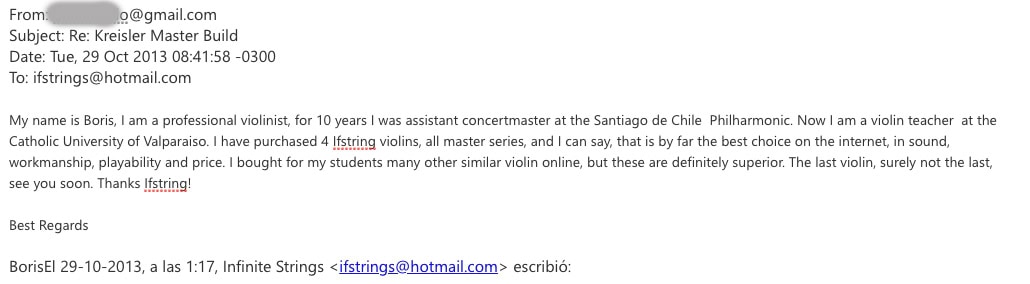 My name is Boris, I am a professional violinist, for 10 years I was assistant concertmaster at the Santiago de Chile Philharmonic. Now I am a violin teacher at the Catholic University of Valparaiso. I have purchased 4 Ifstring violins, all master series, and I can say, that is by far the best choice on the internet, in sound, workmanship, playability and price. I bought for my students many other similar violin online, but these are definitely superior. The last violin, surely not the last, see you soon. Thanks Ifstring!