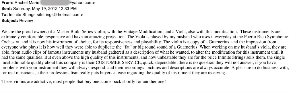 We are the proud owners of a Master Build Series violin, with the Vintage Modification, and a Viola, also with this modification. These instruments are extremely comfortable, responsive and have an amazing projection. The Viola is played by my husband who uses it everyday at the Puerto Rico Symphonic Orchestra, and it is now his instrument of choice, for its responsiveness and playability, over his well above 10K Stopka. When working on my husband’s viola, they are able, from audio clips of famous instruments my husband gathered as a description of what he wanted, to alter the modification for this instrument until it had the same qualities. The violin is a copy of a Guarnerius and the impression from everyone who plays it is how well they were able to duplicate the “fat” or big round sound of a Guarnerius. It offers the refinement found in older instruments, as some ot the characteristics found in 100 years plus violin I owned, but with the projection and power of comtemporary instruments, needed for today’s highly demanding halls and violin orchestral/solo repertoire. But even above the high quality of this instruments, and how unbeatable they are for the price Infinite Strings sells them, the single most admirable quality about this company is their CUSTOMER SERVICE, quick, dependable, there is no question they will not answer, if you have problems with your instrument they will always respond, and their recordings, pictures and descriptions are always accurate. A pleasure to do business with, for real musicians, a their professionalism really puts buyers at ease regarding the quality of instrument they are receiving.These violins are addictive, most people that buy one, come back shortly for another one!