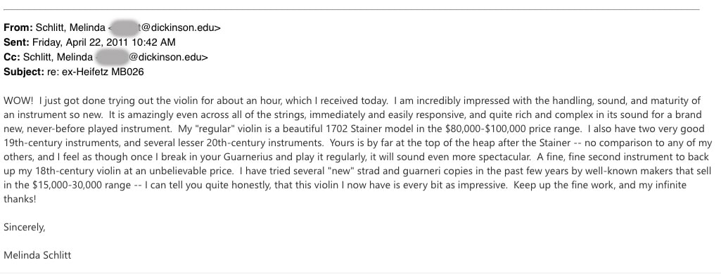 “WOW! I just got done trying out the violin for about an hour, which I received today. I am incredibly impressed with the handling, sound, and maturity of an instrument so new. It is amazingly even across all of the strings, immediately and easily responsive, and quite rich and complex in its sound for a brand new, never-before played instrument. My “regular” violin is a beautiful 1702 Stainer model in the $80,000-$100,000 price range. I also have two very good 19th-century instruments, and several lesser 20th-century instruments. Yours is by far at the top of the heap after the Stainer — no comparison to any of my others, and I feel as though once I break in your Guarnerius and play it regularly, it will sound even more spectacular. A fine, fine second instrument to back up my 18th-century violin at an unbelievable price. I have tried several “new” strad and guarneri copies in the past few years by well-known makers that sell in the $15,000-30,000 range — I can tell you quite honestly, that this violin I now have is every bit as impressive. Keep up the fine work, and my infinite thanks!