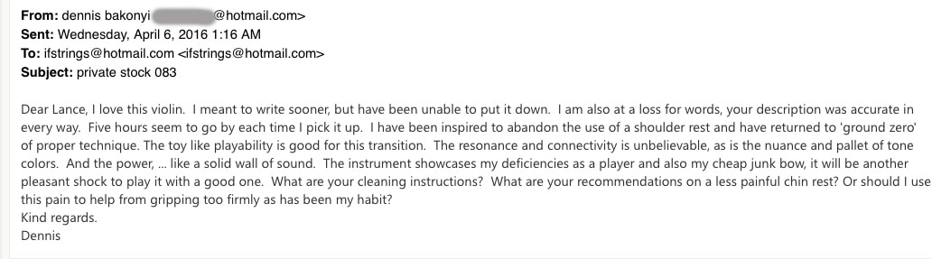 Dear Lance, I love this violin. I meant to write sooner, but have been unable to put it down. I am also at a loss for words, your description was accurate in every way. Five hours seem to go by each time I pick it up. I have been inspired to abandon the use of a shoulder rest and have returned to ‘ground zero’ of proper technique. The toy like playability is good for this transition. The resonance and connectivity is unbelievable, as is the nuance and pallet of tone colors. And the power, … like a solid wall of sound. The instrument showcases my deficiencies as a player and also my cheap junk bow, it will be another pleasant shock to play it with a good one. What are your cleaning instructions? What are your recommendations on a less painful chin rest? Or should I use this pain to help from gripping too firmly as has been my habit?