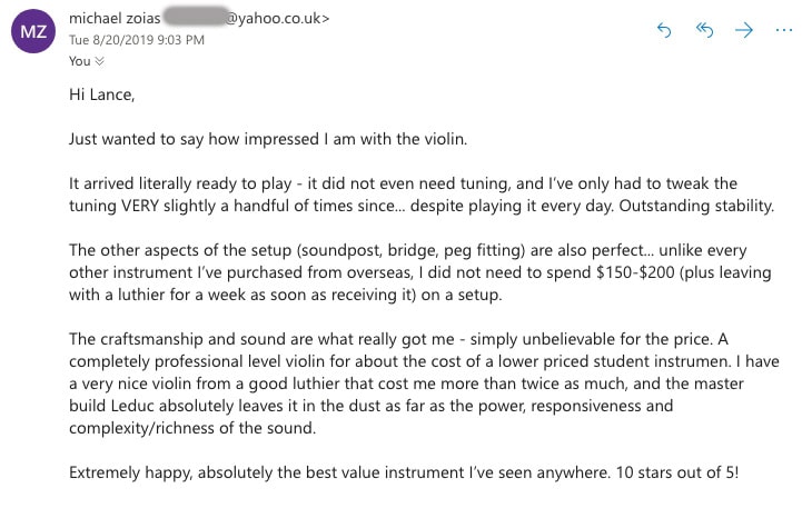 I’m verry happy to have such a beautiful, professionally made instrument with such beautiful and powerful tone. The violin is very easy to play with quick response to different dynamics. I’m verry happy that I made the right decision.